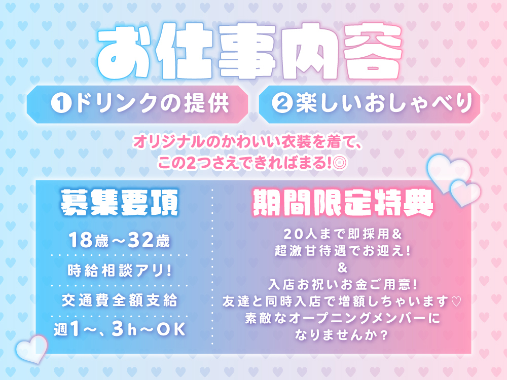 未経験者歓迎、 経験者優遇、 Wワーク歓迎、 週1出勤OK、 月1出勤OK、 終電あがりOK、 土曜日営業、 日曜日営業、 祝日営業、 送りあり、 ニューオープン、 個人ロッカーあり、 連絡先交換なし、 駅から5分以内、 お酒飲めなくてもOK、 女性店長、 友達と応募OK、 即日勤務可能審査確認情報