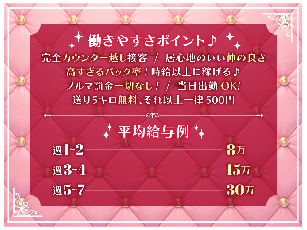 未経験者歓迎、 経験者優遇、 Wワーク歓迎、 週1出勤OK、 終電あがりOK、 土曜日営業、 日曜日営業、 祝日営業、 送りあり、 お酒飲めなくてもOK、 友達と応募OK、 即日勤務可能審査確認情報