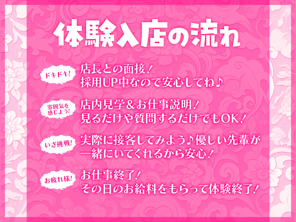 未経験者歓迎、 経験者優遇、 Wワーク歓迎、 週1出勤OK、 終電あがりOK、 土曜日営業、 日曜日営業、 祝日営業、 送りあり、 駅から5分以内、 友達と応募OK、 即日勤務可能審査確認情報