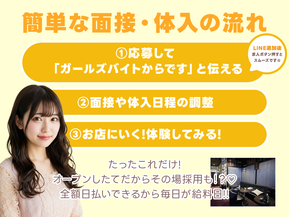 未経験者歓迎、 経験者優遇、 Wワーク歓迎、 週1出勤OK、 月1出勤OK、 終電あがりOK、 土曜日営業、 日曜日営業、 祝日営業、 送りあり、 ニューオープン、 連絡先交換なし、 駅から5分以内、 お酒飲めなくてもOK、 女性店長、 友達と応募OK、 即日勤務可能審査確認情報