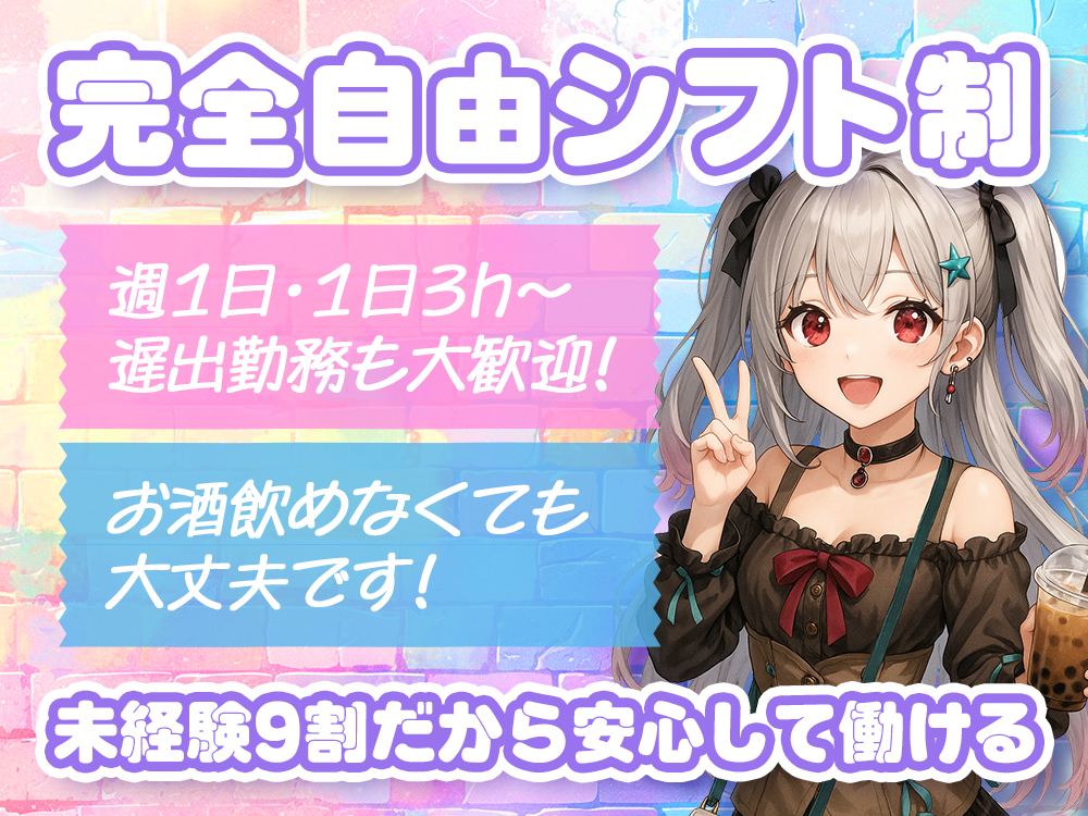 未経験者歓迎、 経験者優遇、 Wワーク歓迎、 週1出勤OK、 月1出勤OK、 終電あがりOK、 土曜日営業、 日曜日営業、 祝日営業、 面接交通費支給、 ニューオープン、 個人ロッカーあり、 連絡先交換なし、 駅から5分以内、 お酒飲めなくてもOK、 女性店長、 友達と応募OK、 即日勤務可能審査確認情報