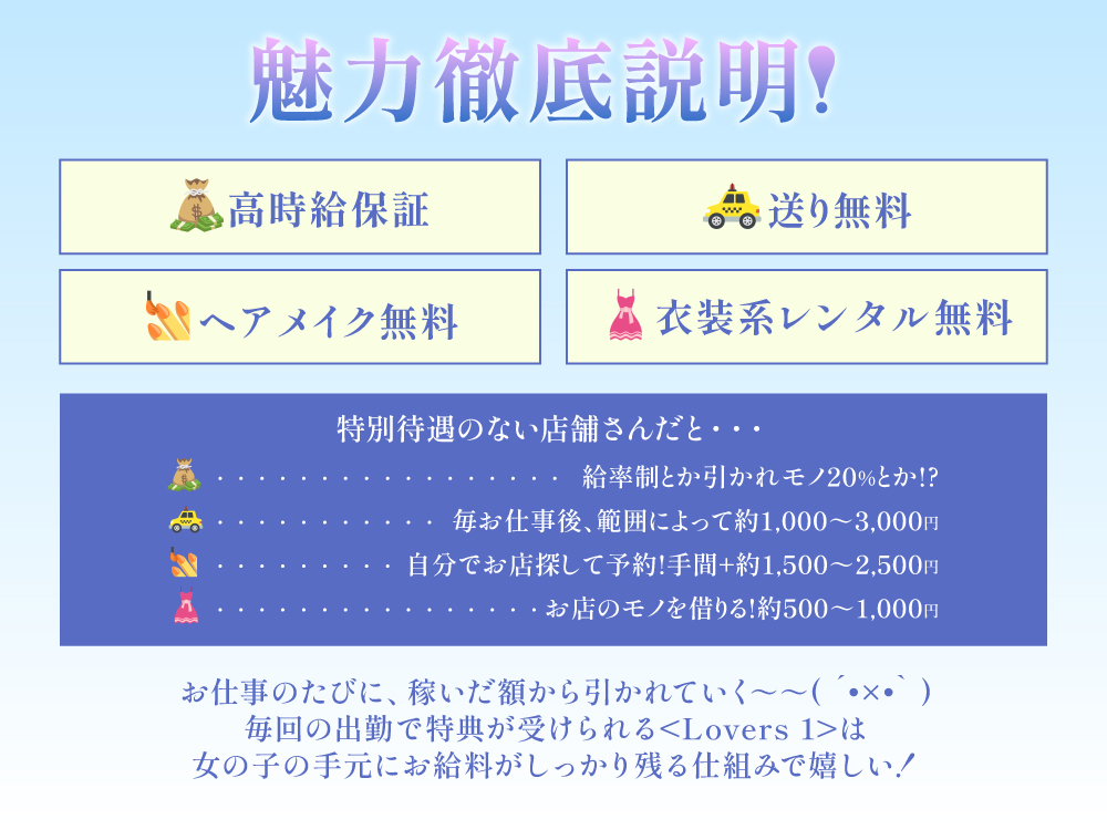 全額日払いOK、 ドリンクバックあり、 昇給あり、 罰金なし、 ノルマなし、 交通費支給身なりのメリット