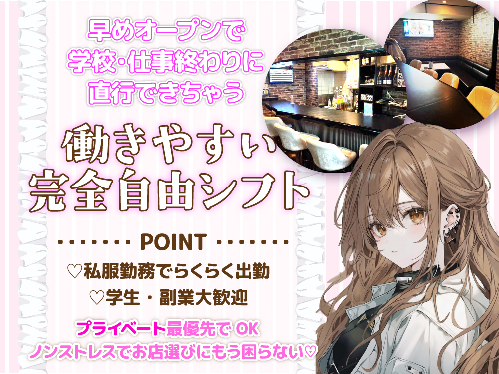 未経験者歓迎、 経験者優遇、 Wワーク歓迎、 週1出勤OK、 月1出勤OK、 終電あがりOK、 土曜日営業、 日曜日営業、 祝日営業、 連絡先交換なし、 駅から5分以内、 お酒飲めなくてもOK、 女性店長、 友達と応募OK、 即日勤務可能審査確認情報
