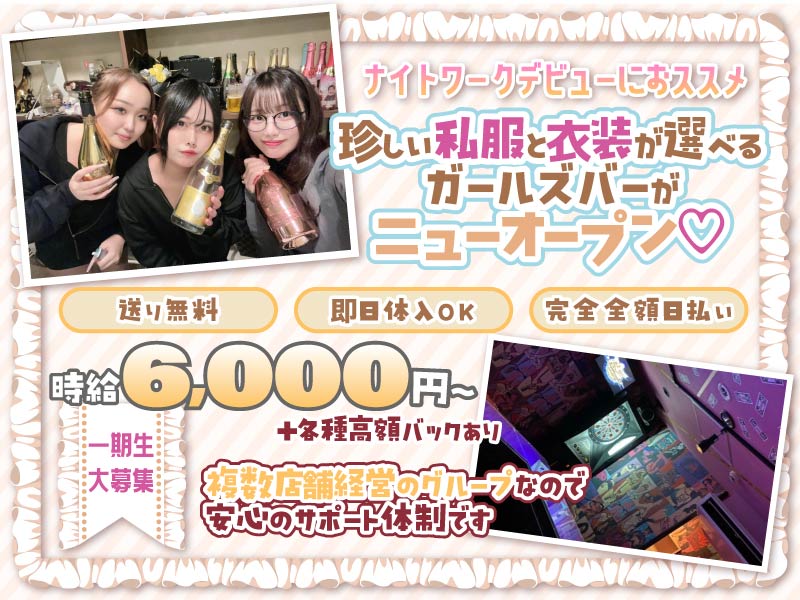 未経験者歓迎、 経験者優遇、 Wワーク歓迎、 週1出勤OK、 月1出勤OK、 終電あがりOK、 土曜日営業、 日曜日営業、 祝日営業、 送りあり、 面接交通費支給、 ニューオープン、 個人ロッカーあり、 駅から5分以内、 お酒飲めなくてもOK、 女性店長、 友達と応募OK、 即日勤務可能審査確認情報