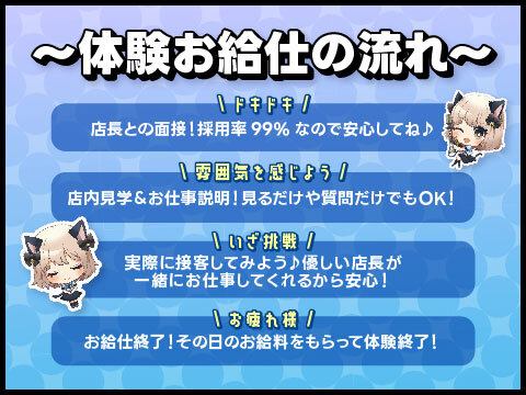 未経験者歓迎、 経験者優遇、 Wワーク歓迎、 週1出勤OK、 月1出勤OK、 終電あがりOK、 土曜日営業、 日曜日営業、 祝日営業、 送りあり、 面接交通費支給、 個人ロッカーあり、 連絡先交換なし、 駅から5分以内、 お酒飲めなくてもOK、 友達と応募OK、 即日勤務可能審査確認情報